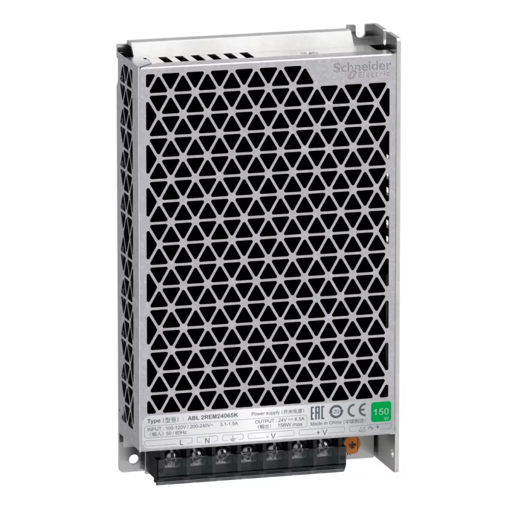 Această sursă de alimentare aparține familiei de produse Easy Modicon (cunoscută anterior sub numele de Phaseo Easy). Este o sursă de alimentare comutată reglată de 24 V c.c., model de 150 W, cu tensiune de intrare de 100 V-240 V c.a. și putere nominală de 156 W. Curentul său de ieșire este de 6,5 A. Oferă performanțe mai bune la un preț rentabil. Răcirea sa se bazează pe convecție naturală. Are comutare manuală a tensiunii. Dimensiunile sale sunt 215 mm lățime x 115 mm înălțime x 30 mm adâncime. Această sursă de alimentare este echipată pentru mașini repetitive. Are certificare ABL2 ps: CE, EAC, KC, RCM, EN62368-1 (siguranță), EN 61000-6-2, EN 61000-4-2/3/4/5/6/8/11 (EMC), 55032 Clasa B, RoHS. Această sursă de alimentare are orificii de montare pentru montarea pe panou sau montarea cu suport în 4 colțuri. Performanță mai bună la un cost mai mic. Design inteligent.