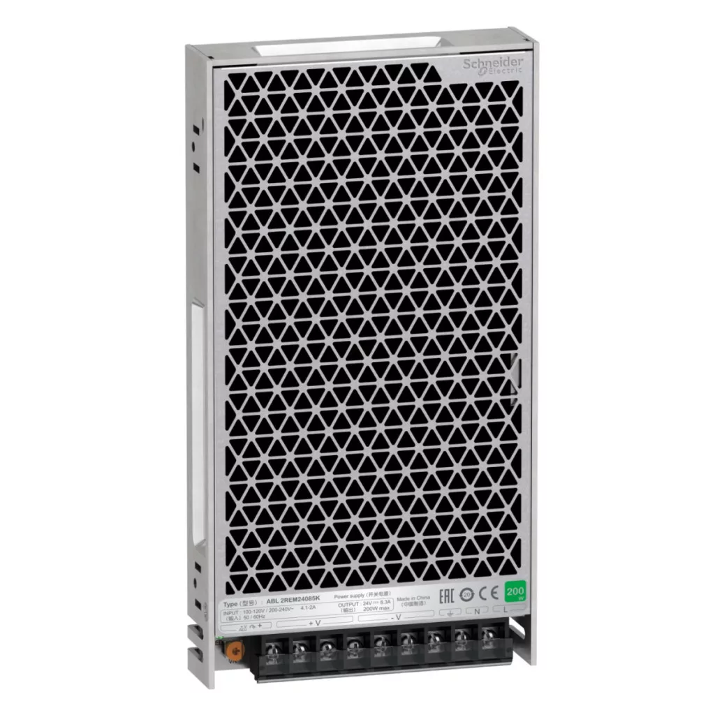 Această sursă de alimentare aparține familiei de produse Easy Modicon (cunoscută anterior sub numele de Phaseo Easy). Este o sursă de alimentare comutată reglată de 24 V c.c., model de 200 W, cu tensiune de intrare de 100 V-240 V c.a. și putere nominală de 200 W. Curentul de ieșire este de 8,3 A. Oferă performanțe mai bune la un preț avantajos. Răcirea se bazează pe convecție naturală. Are comutare manuală a tensiunii. Dimensiuni: 215 mm lățime x 115 mm înălțime x 30 mm adâncime. Această sursă de alimentare este proiectată pentru mașini repetitive. Are certificare ABL2 ps: CE, EAC, KC, RCM, EN62368-1 (siguranță), EN 61000-6-2, EN 61000-4-2/3/4/5/6/8/11 (EMC), 55032 Clasa B, RoHS. Această sursă de alimentare are orificii de montare pentru montarea pe panou sau montarea pe suport cu 4 colțuri. Performanță mai bună la un cost mai mic. Design inteligent.