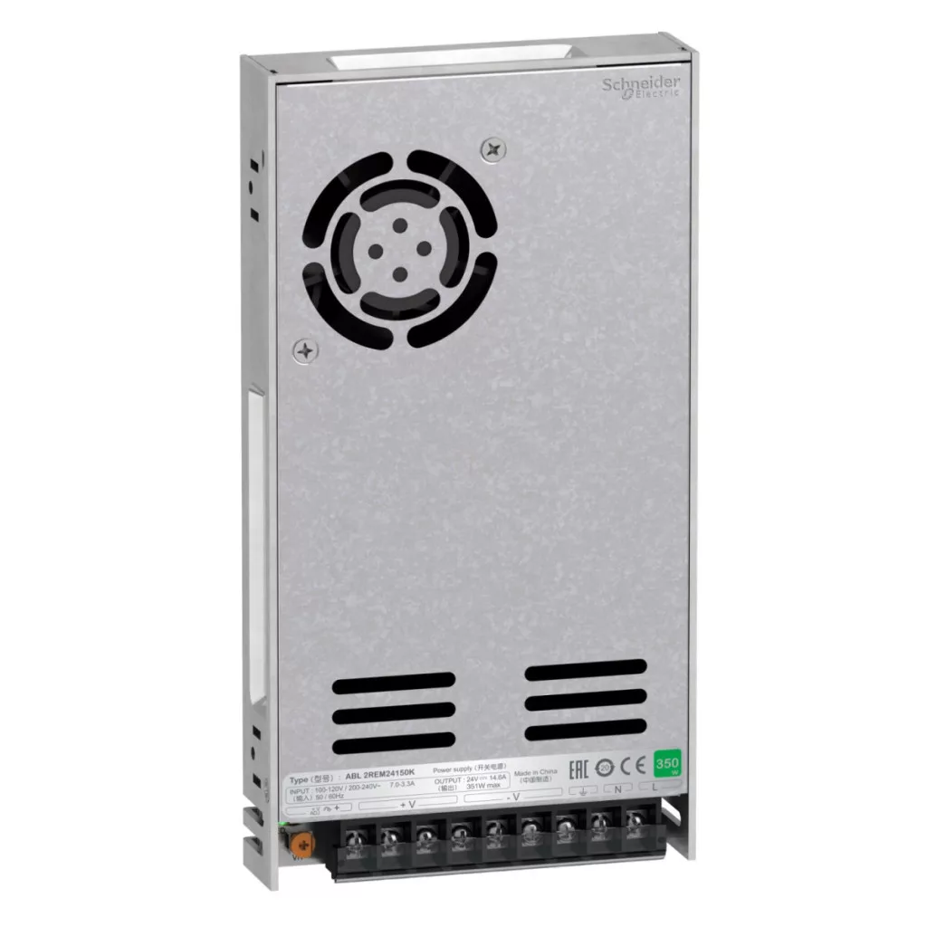 Această sursă de alimentare aparține familiei de produse Easy Modicon (fostă Phaseo Easy). Este o sursă de alimentare comutată reglată de 24 V c.c., model de 350 W, cu tensiune de intrare de 100 V-240 V c.a. și putere nominală de 351 W. Curentul de ieșire este de 14,6 A. Oferă performanțe mai bune la un cost mai mic. Răcirea se bazează pe aer forțat cu un ventilator DC încorporat. Are comutare manuală a tensiunii. Protecția la suprasarcină este de 110-150%. Dimensiuni: 215 mm lățime x 115 mm înălțime x 30 mm adâncime. Această sursă de alimentare este echipată pentru mașini repetitive. Certificată ABL2 ps: CE, EAC, KC, RCM, EN62368-1 (siguranță), EN 61000-6-2, EN 61000-4-2/3/4/5/6/8/11 (EMC), 55032 Clasa B, RoHS. Această sursă de alimentare are orificii de montare pentru montarea pe panou sau montarea cu 4 suporturi de colț. Performanță mai bună la un cost mai mic. Design inteligent.