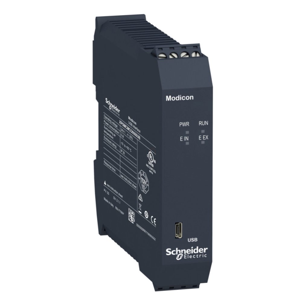 Acest modul de comunicație standard Modicon MCM („fără siguranță”) are un conector Universal Serial Bus cu un conector Mini USB. Este proiectat pentru a monitoriza de la distanță sistemul dvs. de siguranță utilizând protocolul Universal Serial Bus utilizat în mod obișnuit, fără gateway-uri suplimentare. Este echipat cu terminale cu șurub și un bloc conector detașabil pentru conectarea electrică. Produsul are protecție IP20. Modulele de comunicație non-securitate sunt proiectate pentru conectarea de diagnosticare și comunicarea de date pentru magistrale de câmp ale mașinilor sau sisteme de rețea. Viteza de transmisie este de 12 Mbit/s. Acest modul de comunicație se conectează la controlerul de siguranță prin conectorul de expansiune din spate. Cântărește 0,3 kg. Dimensiunile sale sunt 22,5 mm (adâncime), 99 mm (înălțime) și 114,5 mm (lățime). Carcasa sa este roșie. Este alimentat de 24 V CC. Distanța maximă a cablului între cele două dispozitive este de 5 m. Acest modul de comunicație standard Modicon MCM („nesecurizat”) este certificat RCM, CULus și TÜV. Accesoriile compatibile pentru modulul Modicon MCM includ un card de memorie și un conector posterior. Modulul poate fi montat pe o șină DIN de 35 mm, în conformitate cu standardul EN 50022. Sistemul modular de control al siguranței Modicon MCM oferă flexibilitate și scalabilitate de la 8 intrări, 2 ieșiri duble/4 ieșiri cu un singur canal până la 128 de intrări, 16 ieșiri duble/32 ieșiri cu un singur canal și până la 32 sau 48 ieșiri de stare de diagnosticare. Sistemul modular de control al siguranței Modicon MCM este proiectat pentru a monitoriza multiple funcții de siguranță pe și în jurul mașinii, pentru a minimiza riscul de acces la părțile mobile periculoase ale mașinii.