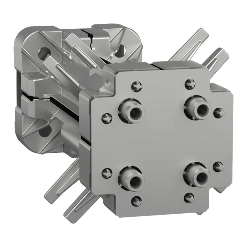 Kitul de asamblare Schneider Electric PrismaSeT - LVS08383 este o soluție profesională pentru asamblarea dulapurilor de distribuție PrismaSeT G cu protecție IP55 în formă pătrată. Acest kit combinat a fost special conceput pentru extinderea carcaselor din seria PrismaSeT G, permițând configurații flexibile de instalare atât în versiunea de podea, cât și în cea de perete. Kit-ul de asamblare LVS08383 include un cadru cu patru coloane care asigură o conexiune mecanică stabilă între dulapurile de distribuție amplasate unul lângă altul. Produsul este fabricat din materiale de înaltă calitate care garantează durabilitate și fiabilitate chiar și în medii industriale. Dispunerea pătrată permite utilizarea optimă a spațiului de instalare disponibil, menținând în același timp gradul de protecție IP55 al sistemului, care oferă protecție împotriva prafului și stropirii cu apă. Kitul de montare Schneider Electric PrismaSeT - LVS08383 are un strat de acoperire alb mat, texturat (RAL 9003), produs prin tratament electroforetic și pulbere epoxidică poliesterică termopolimerizată. Pe lângă aspectul estetic, aceasta oferă o rezistență mecanică și chimică excelentă. Greutatea netă a produsului este de 2,22 kg. În ceea ce privește dimensiunile, ilustrația tehnică arată că placa măsoară 74x74 mm, cu o grosime de 21 mm, iar elementele de conectare ies în afară cu 2,5 mm. Compatibilitatea completă cu cutiile de distribuție din seria PrismaSeT G face ca instalarea să fie rapidă și ușoară, economisind timp și bani în timpul instalării.