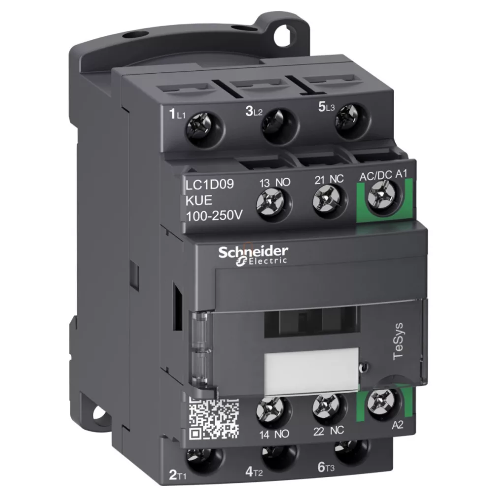 \nComutator magnetic TeSys D, 3p, <= 440V, 9A AC-3, 100...250V AC/DC bobină. Familie de produse: TeSys - Denumire produs: TeSys D Green - Tip produs sau componentă: comutator magnetic - Denumire scurtă dispozitiv: LC1D - Aplicație comutator magnetic: sarcină rezistivă, control motor - Categorie de utilizare: AC-1, AC-3 - desemnarea polilor: 3P - compoziția contactului polilor: 3 NO - tensiunea circuitului de control: 100...250 V AC 50/60 Hz, 100...250 V DC - tip bobină: electronică AC/DC - compoziție contact auxiliar: 1 NO + 1 NC - categorie supratensiune: III - curent termic convențional în aer liber Ith: 10 A -<= 60 °C pentru circuitul de semnal, 25 A -<= 60 °C pentru circuitul principal - Capacitate nominală de comutare Irms: 140 A AC pentru circuitul de semnal conform IEC 60947-5-1, 250 A -440 V pentru circuitul principal, conform IEC 60947, 250 A DC pentru circuitul de semnalizare, conform IEC 60947-5-1 - Curent nominal de rezistență la scurtcircuit Icw: 100 A 1 s circuit de semnalizare, 105 A <= 40 °C 10 s circuit principal, 120 A 500 ms circuit de semnalizare, 140 A 100 ms circuit de semnalizare, 210 A <= 40 °C 1 s circuit principal, 30 A <= 40 °C 10 min circuit principal, 61 A <= 40 °C 1 min circuit principal - dimensiunea siguranței conectate: 10 A gG în cazul circuitului de semnalizare conform IEC 60947-5-1, 20 A gG -<= 690 V tip de coordonare 2, circuit principal în cazul coordonării, 25 A gG -<= 690 V tip de coordonare 1, circuit principal în cazul coordonării - Tensiune nominală de izolație Ui: 690 V circuit principal conform IEC 60947-4-1, 690 V circuit de semnalizare conform IEC 60947-1 - durată de viață electrică: 0,6 milioane de cicluri la 25 A AC-1 Ue <= 440 V - pierdere de putere pe pol: 0,2 W AC-3, 1.56 W AC-1 - capac de protecție: cu, cu - suport de montare: placă, șină - standarde: CSA C22.2 Nr. 60947-4-1, EN/IEC 60947-4-1, EN/IEC 60947-5-1, UL 60947-4-1 - certificare produs: CCC, CSA, EAC, KC, LROS (Lloyds register of shipping), UL - tip conexiune: circuit de control: borne cu șurub 1 cablu 1...4 mm² - rigiditate cablu: solid, circuit de control: borne cu șurub 2 cabluri 1...4 mm² - rigiditate cablu: solid - cuplu de strângere: circuit principal: 1,7 N.m - borne cu șurub - șurubelniță nr. 2 Philips, circuit principal: 1,7 N.m - cu borne cu șurub - cu șurubelniță Ø 6 mm placă, circuit de control: 1,7 N.m - cu borne cu șurub - cu șurubelniță nr. 2 Philips, circuit de control: 1,7 N.m - lângă clemele cu șurub - cu șurubelniță placă Ø 6 mm - timp de funcționare: 20...90 ms deschidere, 45...55 ms închidere - nivel de fiabilitate de siguranță: B10d = 1369863 cicluri comutator magnetic cu sarcină nominală conform EN/ISO 13849-1, B10d = 20000000 cicluri comutator magnetic cu sarcină mecanică conform EN/ISO 13849-1. Avantaje: .. Aplicații: Comutatoarele magnetice TeSys D se pot integra perfect în sistemele de control, numerele de comandă specifice BL sau BBE sunt compatibile cu modulele I/O digitale de 100 mA sau 500 mA....