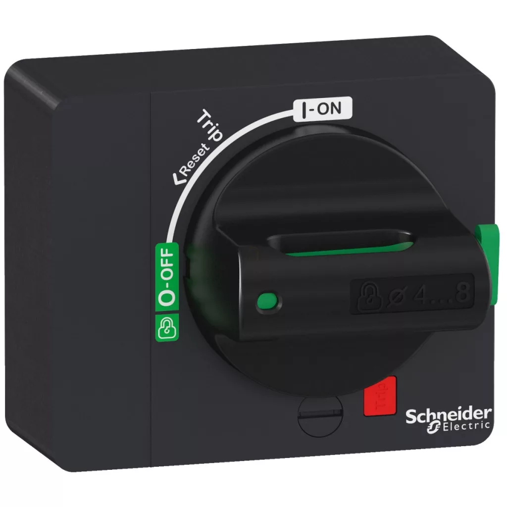 Mâner rotativ direct TeSys GV pentru întrerupătoare de circuit GV4PE, LE, PEM, PB sau piesă de schimb pentru mânere GV4P, GV4L. Pentru utilizare cu comutatorul principal, are un mâner negru pe panoul frontal negru cu 3 poziții: OFF, ON, TRIP. Echipat cu un buton „Push to trip” (Apăsați pentru declanșare). Poate fi blocat în poziția OFF sau ON cu până la 3 lacate (trebuie comandate separat). Blocarea în poziția ON nu împiedică declanșarea întrerupătorului de circuit (blocarea trebuie eliberată pentru a elimina defectul). Compatibil cu Green Premium (RoHS/REACh).