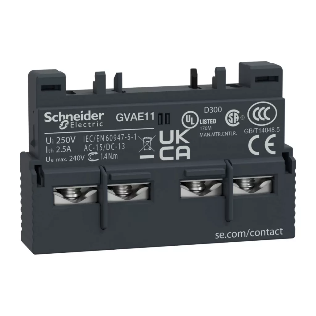 Bloc de contacte auxiliare TeSys GV pentru întrerupătoare de protecție a motorului GV2 și GV3. 1NO+1NC contacte auxiliare instantanee. Tensiune nominală de funcționare: max. 2 A/240 V c.a. și 1 A/60 V c.c. Se montează pe partea frontală a întrerupătorului, cu conexiune cu clemă cu șurub. Se vinde în pachete de 10 bucăți. Conform cu multiple standarde (IEC, UL, CSA, CCC, EAC), conform cu Green Premium (RoHS/REACh).