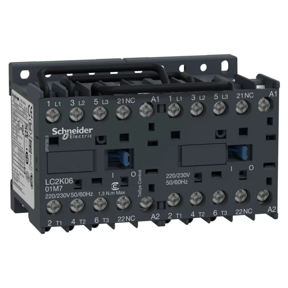 Releu de protecție pentru schimbarea direcției TeSys LC2-K, 3 poli, AC-3 440 V 6A, bobină 115 V AC. Familie de produse: TeSys - denumirea produsului: TeSys K - denumirea scurtă a dispozitivului: LC2K - aplicația dispozitivului: control - aplicația comutatorului magnetic: control motor - categoria de utilizare: AC-3, AC-4 - descrierea dispozitivului: comutator de direcție asamblat în fabrică cu bară colectoare de curent ridicat - desemnarea polilor: 3P - compoziția contactelor polilor: 3 NO - tensiune nominală de funcționare Ue: <= 690 V AC 50/60 Hz pentru circuitul de semnalizare, 690 V c.a. 50/60 Hz circuit principal - puterea motorului kW: 1,5 kW -220...230 V c.a. 50/60 Hz, 2,2 kW -380...415 V c.a. 50/60 Hz, 3 kW -440 V c.a. 50/60 Hz, 3 kW -480 V c.a. 50/60 Hz, 3 kW -500...600 V c.a. 50/60 Hz, 3 kW -660...690 V c.a. 50/60 Hz - compoziție contact auxiliar: 1 NC - categorie de supratensiune: III - curent termic convențional Ith în aer liber: 10 A -<= 50 °C pentru circuitul de semnal, 20 A -<= 50 °C pentru circuitul principal - Capacitate nominală de comutare Irms: 110 A CA pentru circuitul principal conform IEC 60947, 110 A CA pentru circuitul principal conform NF C 63-110, 110 A CA pentru circuitul de semnalare este conform cu IEC 60947 - capacitate nominală de întrerupere: 110 A -220...230 V este conform cu IEC 60947, 110 A -380...400 V este conform cu IEC 60947, 110 A -415 V este conform cu IEC 60947, 110 A -440 V este conform cu IEC 60947, 70 A -660...690 V este conform cu IEC 60947, 80 A -500 V este conform cu IEC 60947 - Curent nominal de rezistență la scurtcircuit Icw: 110 A 100 ms circuit de semnal, 20 A <= 50 °C >= 15 min circuit principal, 40 A <= 50 °C 3 min circuit principal, 45 A <= 50 °C 1 min circuit principal, 60 A <= 50 °C 30 s circuit principal, 80 A <= 50 °C 10 s circuit principal, 80 A 1 s circuit de semnalizare, 85 A <= 50 °C 5 s circuit principal, 90 A <= 50 °C 1 s circuit principal, 90 A 500 ms circuit de semnal - dimensiunea siguranței conectate: 10 A circuitul de semnal gG este conform cu IEC 60947, 10 A gG, circuitul de semnalizare este conform cu VDE 0660, 25 A aM circuit principal, 25 A gG -<= 440 V circuit principal - Tensiune nominală de izolație Ui: 600 V circuit principal conform cu CSA C22.2 Nr. 14, circuitul principal de 600 V este conform cu UL 508, circuitul de semnalizare de 600 V este conform cu CSA C22.2 nr. 14, circuitul de semnalizare de 600 V este conform cu UL 508, circuitul principal de 690 V este conform cu IEC 60947-4-1, circuitul de semnalizare este conform cu IEC 60947-4-1 la 690 V, circuitul de semnalizare este conform cu IEC 60947-5-1 la 690 V - tip de blocare: mecanic - suport de montare: placă, șină - standarde: BS 5424, IEC 60947, NF C 63-110, VDE 0660 - certificate de produs: CSA, UL - tip de conectare: borne cu șurub 1 cablu 0,34...2,5 mm² - rigiditate cablu: flexibil - cu terminare cablu, borne cu șurub 1 cablu 0,75...4 mm² - rigiditate cablu: flexibil - fără terminare cablu, borne cu șurub 1 cablu 1,5...4 mm² - rigiditate cablu: rigid, cleme cu șurub 2 cabluri 0,34...1,5 mm² - rigiditate cablu: flexibil - cu, capăt cablu, cleme cu șurub 2 cabluri 0,75...4 mm² - rigiditate cablu: flexibil - fără capăt de cablu, cleme cu șurub 2 cabluri 1,5...4 mm² - rigiditate cablu: rigid - cuplu de strângere: 1,3 N.m - cu cleme cu șurub - cu șurubelniță nr. 2 Philips, 1,3 N.m - cu cleme cu șurub - cu șurubelniță Ø 6 mm placă - timp de funcționare: 10...20 ms dezactivare bobină și deschidere NO, 10...20 ms activare bobină și închidere NO - nivel de fiabilitate de siguranță: B10d = 1369863 cicluri comutator magnetic cu sarcină nominală conform EN/ISO 13849-1, B10d = 20.000.000 de cicluri ale comutatorului magnetic cu sarcină mecanică, conform EN/ISO 13849-1 - durabilitate mecanică: 5 Mcycles. Avantaje: oferă un factor și o integrare perfectă în toate aplicațiile.... Aplicații: Industrie, infrastructură, automatizarea clădirilor: Sisteme de control simple Zone sensibile la zgomot, rețele cu interferențe ridicate: Comutator magnetic silențios.