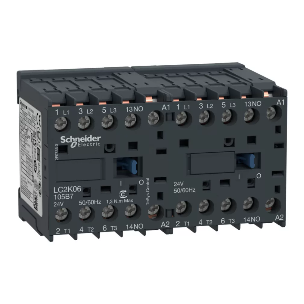 \nReleu de protecție împotriva schimbării de direcție TeSys LC2-K, 3 poli, AC-3 440 V 6A, bobină 24 V AC. Familie de produse: TeSys - denumirea produsului: TeSys K - denumirea scurtă a dispozitivului: LC2K - aplicația dispozitivului: control - aplicația comutatorului magnetic: control motor - categoria de utilizare: AC-3, AC-4 - descrierea dispozitivului: comutator direcțional asamblat în fabrică cu bară colectoare de curent înalt - desemnarea polilor: 3P - compoziția contactelor polilor: 3 NO - tensiune nominală de funcționare Ue: <= 690 V AC 50/60 Hz pentru circuitul de semnalizare, 690 V c.a. 50/60 Hz circuit principal - puterea motorului kW: 1,5 kW -220...230 V c.a. 50/60 Hz, 2,2 kW -380...415 V c.a. 50/60 Hz, 3 kW -440 V c.a. 50/60 Hz, 3 kW -480 V c.a. 50/60 Hz, 3 kW -500...600 V c.a. 50/60 Hz, 3 kW -660...690 V CA 50/60 Hz - compoziție contact suplimentar: 1 NO - categorie de supratensiune: III - curent termic convențional în aer liber Ith: 10 A -<= 50 °C pentru circuitul de semnal, 20 A -<= 50 °C pentru circuitul principal - Capacitate nominală de comutare Irms: 110 A CA pentru circuitul principal conform IEC 60947, 110 A CA pentru circuitul principal conform NF C 63-110, 110 A CA pentru circuitul de semnalare este conform cu IEC 60947 - capacitate nominală de întrerupere: 110 A -220...230 V este conform cu IEC 60947, 110 A -380...400 V este conform cu IEC 60947, 110 A -415 V este conform cu IEC 60947, 110 A -440 V este conform cu IEC 60947, 70 A -660...690 V este conform cu IEC 60947, 80 A -500 V este conform cu IEC 60947 - Curent nominal de rezistență la scurtcircuit Icw: 110 A 100 ms circuit de semnal, 20 A <= 50 °C >= 15 min circuit principal, 40 A <= 50 °C 3 min circuit principal, 45 A <= 50 °C 1 min circuit principal, 60 A <= 50 °C 30 s circuit principal, 80 A <= 50 °C 10 s circuit principal, 80 A 1 s circuit de semnal, 85 A <= 50 °C 5 s circuit principal, 90 A <= 50 °C 1 s circuit principal, 90 A 500 ms circuit de semnal - dimensionarea siguranței conectate: circuit de semnal 10 A gG conform IEC 60947, 10 A gG, circuitul de semnalizare este conform cu VDE 0660, 25 A aM circuit principal, 25 A gG -<= 440 V circuit principal - Tensiune nominală de izolație Ui: 600 V circuit principal conform cu CSA C22.2 Nr. 14, circuitul principal de 600 V este conform cu UL 508, circuitul de semnalizare de 600 V este conform cu CSA C22.2 nr. 14, circuitul de semnalizare de 600 V este conform cu UL 508, circuitul principal de 690 V este conform cu IEC 60947-4-1, circuitul de semnalizare este conform cu IEC 60947-4-1 la 690 V, circuitul de semnalizare este conform cu IEC 60947-5-1 la 690 V - tip de blocare: mecanic - suport de montare: placă, șină - standarde: BS 5424, IEC 60947, NF C 63-110, VDE 0660 - certificate de produs: CSA, UL - timp de funcționare: 10...20 ms dezactivare bobină și deschidere NO, 10...20 ms activare bobină și închidere NO - nivel de fiabilitate de siguranță: B10d = 1369863 cicluri comutator magnetic cu sarcină nominală conform EN/ISO 13849-1, B10d = 20.000.000 de cicluri comutator magnetic cu sarcină mecanică conform EN/ISO 13849-1 - durabilitate mecanică: 5 Mcycles. Avantaje: oferă un factor și o integrare perfectă în toate aplicațiile.... Aplicații: Industrie, infrastructură, automatizarea clădirilor: Sisteme de control simple Zone sensibile la zgomot, rețele cu interferențe ridicate: Comutator magnetic silențios.