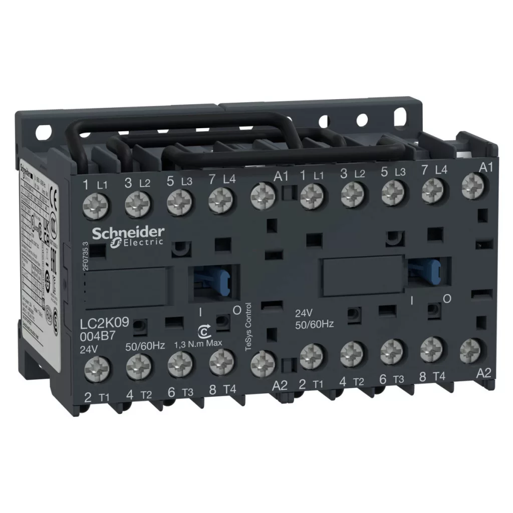 Comutatorul Schneider Electric TeSys seria LC2K09004M7 este un comutator magnetic compact, dar extrem de fiabil, cu 4 poli, care este deosebit de potrivit pentru comutarea sarcinilor rezistive. Produsul aparține categoriei de utilizare AC-1, fiind ideal pentru aplicații în care trebuie comutate sarcini neinductive sau ușor inductive, cum ar fi elemente de încălzire sau rezistențe. Acest membru al familiei TeSys K este echipat din fabrică cu o bară colectoare de inversare, care accelerează și simplifică semnificativ procesul de instalare. Comutatorul are un curent nominal de funcționare de 20 A (la o temperatură ambiantă sub 60 °C), o tensiune maximă de 440 V CA și aparține categoriei de utilizare AC-1. Circuitul de control funcționează la 220-230 V c.a. 50/60 Hz, fiind compatibil cu majoritatea sistemelor electrice europene. Dimensiunile compacte ale dispozitivului (înălțime: 58 mm, lățime: 90 mm, adâncime: 57 mm) permit instalarea cu economie de spațiu chiar și în dulapuri de comandă înguste. Contactorul TeSys K LC2K09004M7 are o durată de viață electrică și mecanică remarcabilă. Durata sa de viață electrică este de 0,16 milioane de cicluri de comutație la o sarcină de 20 A AC-1 (Ue ≤ 690 V), în timp ce durata sa de viață mecanică ajunge la 5 milioane de cicluri de comutație. Dispozitivul are o frecvență maximă de comutare de 3.600 de cicluri pe oră, ceea ce permite o utilizare intensivă. Timpul său de funcționare este extrem de rapid: trec doar 10-20 ms între excitarea bobinei și închiderea contactelor NO, precum și între dezactivarea bobinei și deschiderea contactelor NO. Contactorul are un grad de protecție IP20 conform VDE 0106 și poate fi utilizat într-un interval larg de temperaturi ambientale (-25...50 °C). Produsul este conform cu o serie de standarde internaționale, printre care: EN/IEC 60947-4-1, GB/T 14048.4, UL 60947-4-1, CSA C22.2 Nr. 60947-4-1, JIS C8201-4-1. De asemenea, are certificări CB Scheme, CCC, UL, CSA, EAC, CE și UKCA, asigurând aplicabilitatea la nivel global. Este conectat cu terminale cu șurub care pot gestiona în mod flexibil diferite dimensiuni de cabluri: cablu solid de 1,5-4 mm², cablu torsadat de 0,75-4 mm² fără capete de cablu și cablu torsadat de 0,34-2,5 mm² cu capete de cablu. Cuplul de strângere al terminalelor este de 0,8-1,3 Nm. Poate fi montat pe o șină DIN sau pe o placă de montare și are un dispozitiv de blocare mecanic pentru o funcționare sigură.