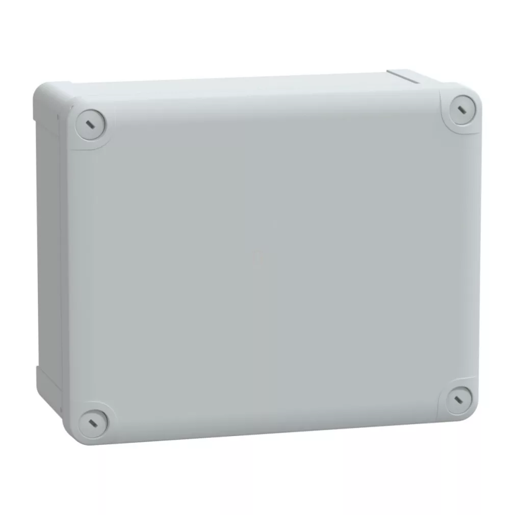 \nCutie industrială din plastic (241*192*105). Familia de produse: Thalassa - Denumirea produsului: Thalassa TBP - Aplicație dispozitiv: multifuncțional - Înălțime: 241 mm - Lățime: 194 mm - Adâncime: 107 mm - Înălțime internă: 225 mm - Lățime internă: 175 mm - Adâncime internă: 100 mm - Montare dulap: montare pe perete - Componența dispozitivului: 1 x capac, 1 x corp, 4 x șuruburi capac - Tip corp: turnat dintr-o singură bucată - Fixare capac: șuruburi din plastic. Avantaje: .. Aplicații: ..