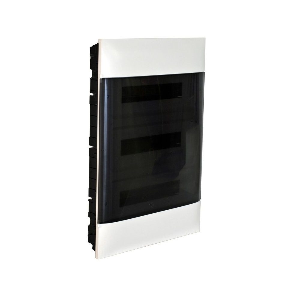 Legrand 137178 PractiboxS gipszkartonba süllyeszthető kiselosztó, 3 sor 18 modul, átlátszó füstszínű ajtóval, védőföld és nulla elosztókapoccsal