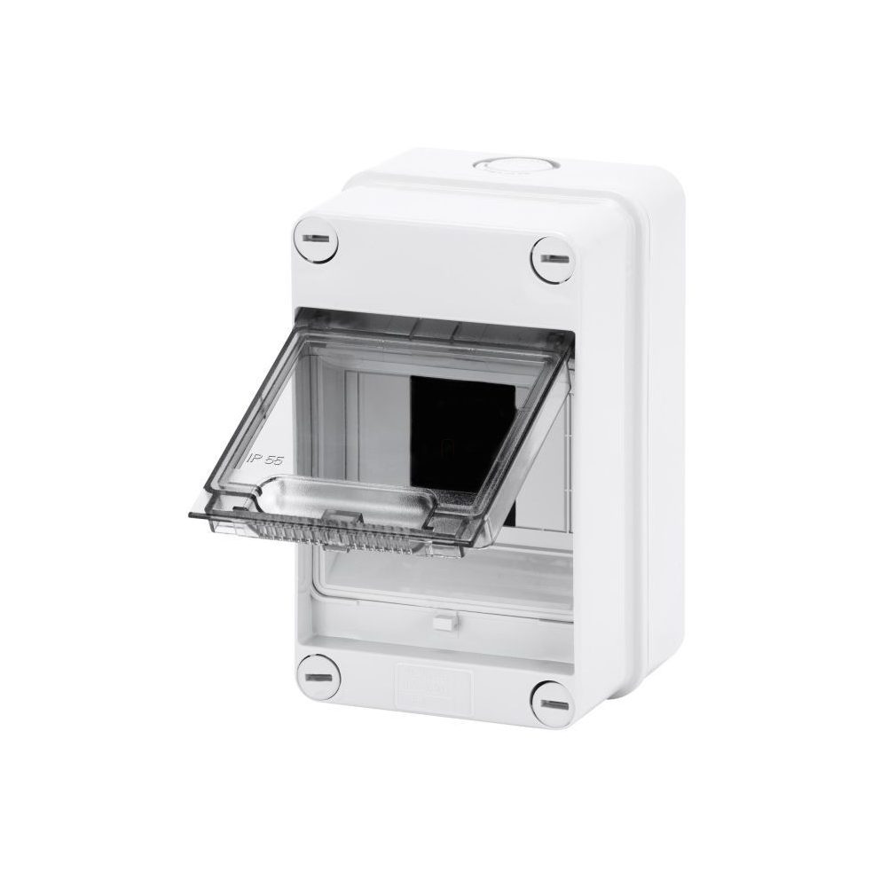 Kiselosztó falonkívüli 1soros, 4 modulos átlátszó ajtóval IP55 sín nélkül, 1000V DC, UV-álló GW40001