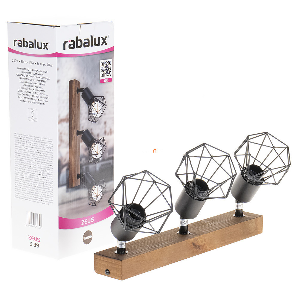 Spotul Zeus Rábalux 3139 are trei socluri E14, ceea ce permite utilizarea mai multor surse de lumină interschimbabile. Corpul lămpii este realizat din metal și lemn, care apar într-o combinație de culori naturale de lemn și negru. Dimensiunile totale ale lămpii sunt 525 mm lungime, 95 mm lățime și 150 mm înălțime. Produsul are protecție IP20, fiind potrivit pentru utilizare în interior. Sursa de lumină nu este inclusă, iar lampa nu este reglabilă. Ambalajul măsoară 12x10x35 cm, iar lampa cântărește 0,61 kg. Producătorul este Rábalux.