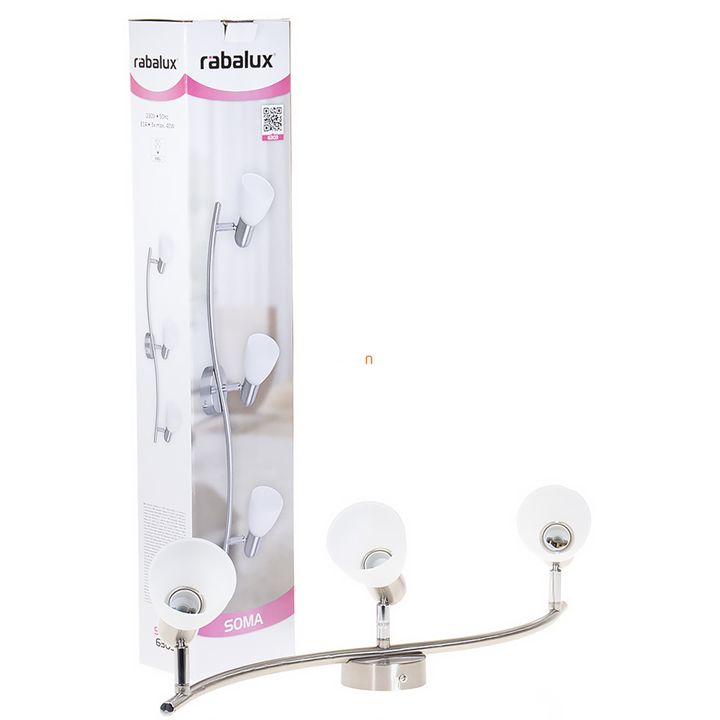 Spotul de tavan Soma Rábalux 6303 are trei socluri E14, fiind compatibil cu diverse surse de lumină. Corpul de iluminat are un design modern, fiind realizat în principal din metal și sticlă, într-o combinație de culori argintiu și opal. Produsul cântărește 1,22 kg și are dimensiunile de 80 mm lungime, 600 mm lățime și 170 mm înălțime. Corpul de iluminat are un grad de protecție IP20 și este potrivit pentru utilizare în interior. Sursa de lumină nu este inclusă, astfel încât fluxul luminos, culoarea luminii, puterea și temperatura culorii pot varia în funcție de becul ales. Lampa nu este reglabilă, iar soclurile sunt amplasate pe trei brațe separate, fiecare dintre acestea putând fi reglată individual. Dimensiunile ambalajului sunt: 12 cm lățime, 8 cm lungime și 61 cm înălțime. Producătorul este Rábalux.