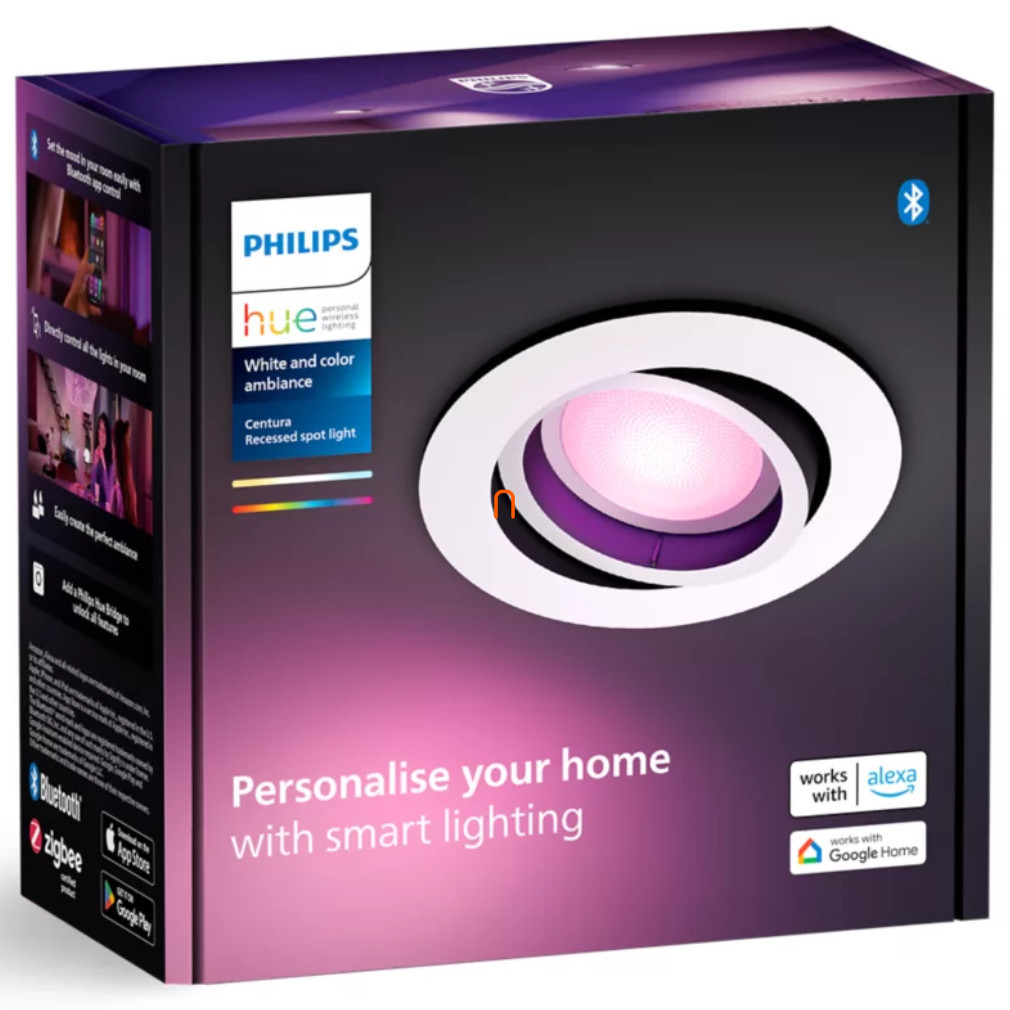 Spotul încastrat Philips Hue Centura White and Colour Ambiance este disponibil într-un pachet de trei bucăți, conceput pentru a fi încastrat în tavane suspendate. Produsul are o carcasă din plastic alb, iar fiecare corp de iluminat are o soclu GU10 cu o sursă de lumină înlocuibilă. Luminozitatea și temperatura culorii luminilor pot fi controlate prin intermediul interfețelor Bluetooth și Zigbee, ceea ce le face compatibile cu sistemele inteligente pentru locuințe. Spoturile au protecție IP20, un diametru și o înălțime de 90 mm, o dimensiune de decupare de 70 mm și o adâncime de instalare de 100 mm. Dimensiunile ambalajului sunt 21 cm lățime, 20 cm lungime și 10 cm înălțime, cu o greutate totală de 0,91 kg. Produsul este fabricat de Signify, cu codul logistic 929003809701.