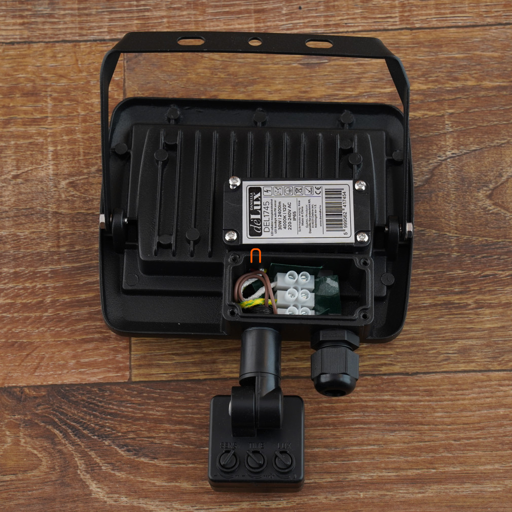 Spot LED 30W cu senzor de mișcare, bloc terminal, balast 4000K 2400lm IP65 120 grade SMD, plat, negru deLux DEL1745