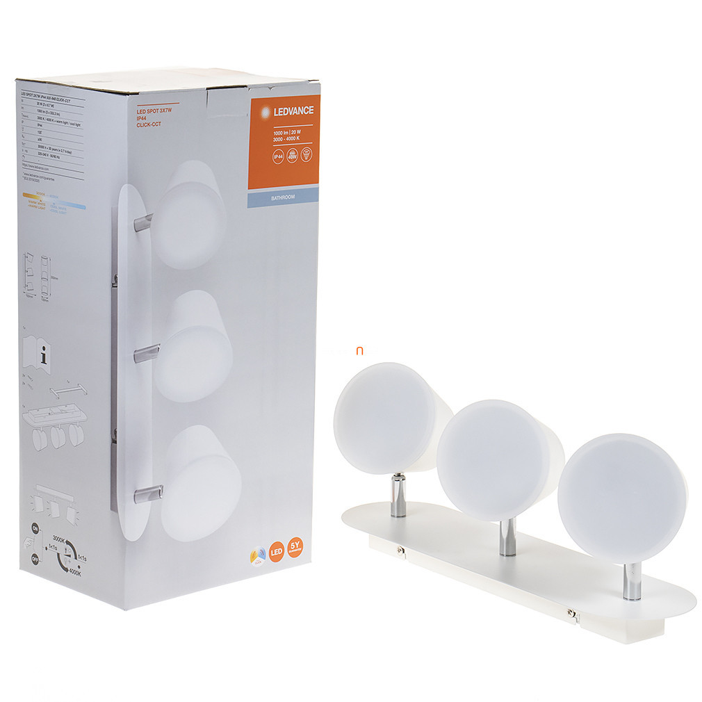 Spotul LED Ledvance cu comutator pentru băi este un corp de iluminat modern, de culoare albă, fabricat din aluminiu și plastic. Corpul de iluminat conține trei module LED de 7 wați, cu o putere totală de 21 W și un flux luminos de 1000 lumeni. Temperatura culorii sursei de lumină poate fi selectată între 3000 K (alb cald) și 4000 K (alb rece) folosind un comutator, adaptându-se astfel la nevoile utilizatorului. Corpul de iluminat are protecție IP44, fiind potrivit pentru utilizarea în băi. Modulul LED încorporat are o durată de viață medie de 30.000 de ore. Dimensiuni: 350 mm lungime, 100 mm lățime, 150 mm înălțime. Dimensiuni ambalaj produs: 13 cm lățime, 19 cm lungime, 39 cm înălțime. Producător: Ledvance.