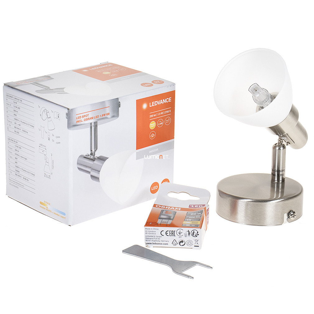 Lampa spot Ledvance cu sursă de lumină este o lampă de perete modernă, de culoare argintie, fabricată din aluminiu, cu un singur soclu G9. Corpul de iluminat funcționează cu un modul LED de 1,9 W, care oferă un flux luminos de 200 lumeni, cu o temperatură de culoare albă caldă de 2700 K. Produsul are o eficiență luminoasă de 105 lm/W și o durată medie de viață de 15.000 de ore. Lampa nu este reglabilă, are un grad de protecție IP20 și rezistență la impact IK03. Dimensiunile sale sunt 80 mm lungime, 80 mm lățime și 142 mm înălțime. Pachetul include sursa de lumină, fabricată de Ledvance.