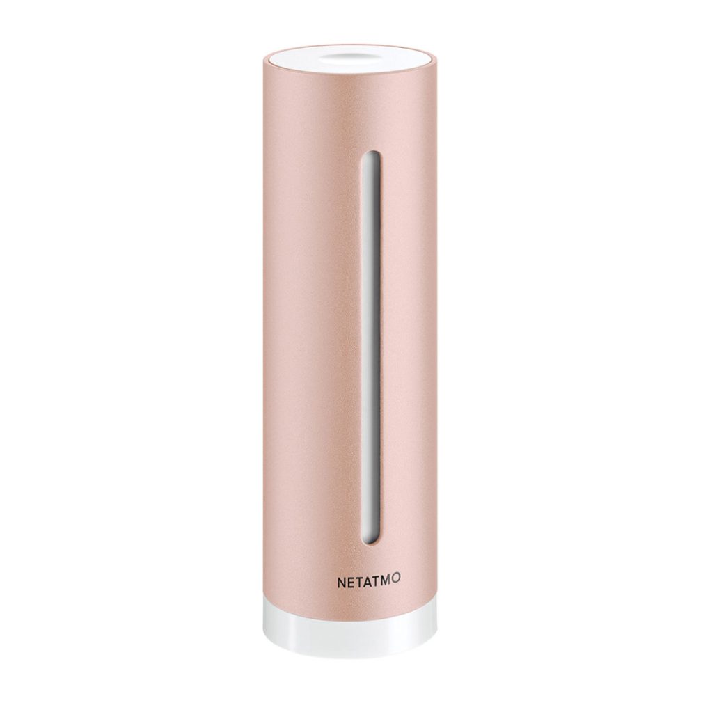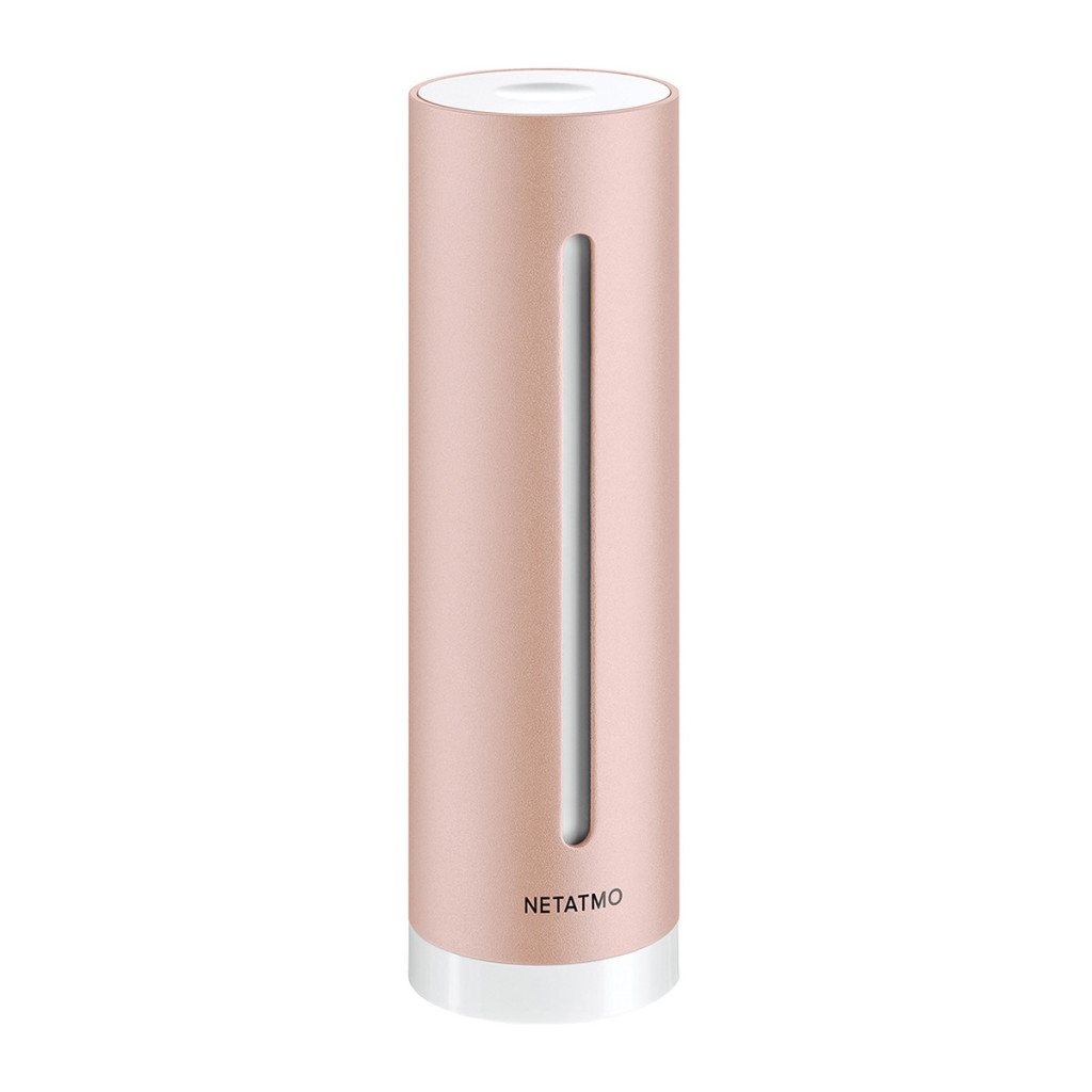 Stație inteligentă Netatmo pentru monitorizarea calității aerului, design tip turn, măsurători: calitatea aerului, nivelul de zgomot, umiditatea și temperatura, culoare roz auriu