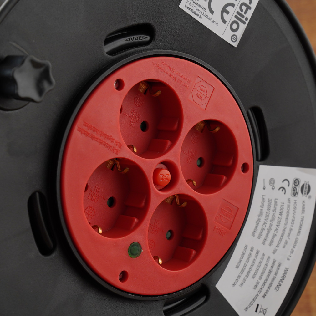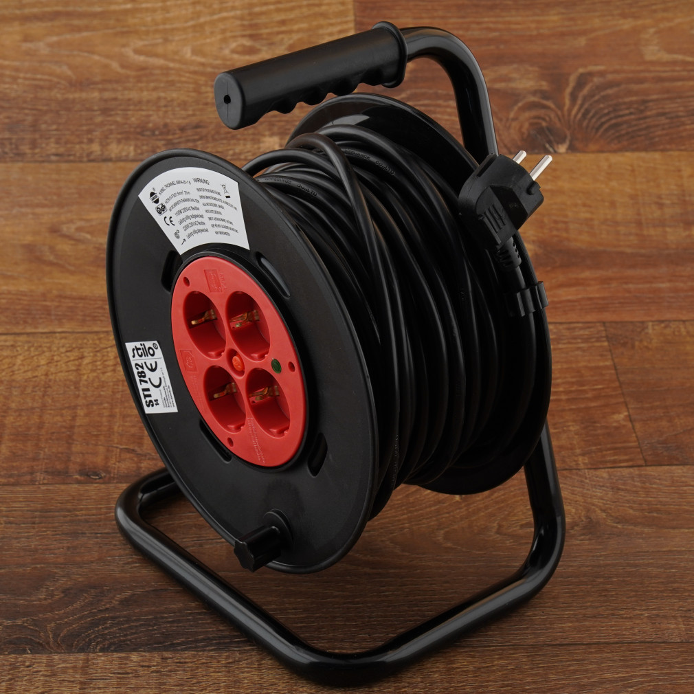 Bobină de cablu din plastic cu 2 poli și suport metalic, 25 m. Cablu MT 3x1,5 mm², 4 prize de protecție Stilo STI782