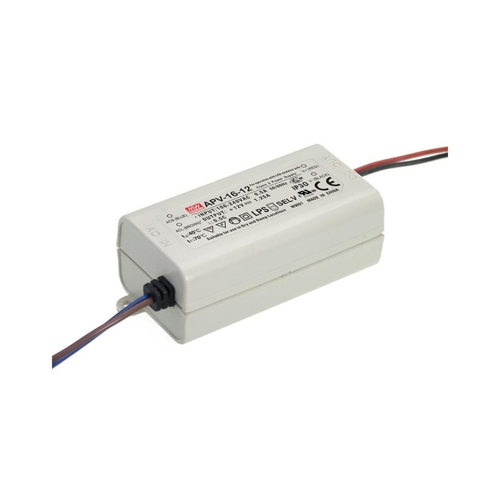Sursă de alimentare LED Mean Well cu o singură ieșire, APV-16-12\nVin: 90-264 VAC/127-370 VDC, Vout: 12 VDC / 0-1 A, P: 15 W