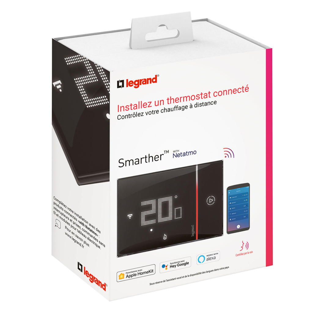 Termostat inteligent Legrand Smarther2, încastrat, negru, terminal cu șurub (230 V~ L+N), conexiune Wi-Fi directă/Netatmo - 49039