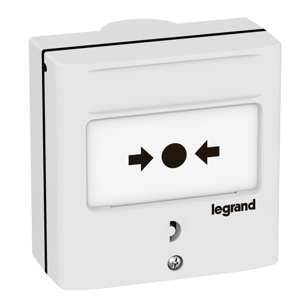 Transmițător manual de semnal Legrand pentru oprire de urgență, alb RAL 9003, cu 1 contact inversor-5A-24V=, IP30-IK07 - 138071