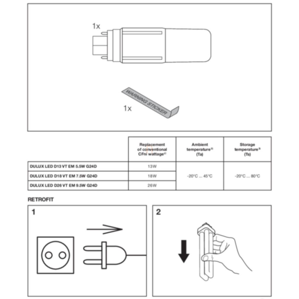 Tub LED Osram G24d 7,5 W, 870 lm, 3000 K, alb cald, plastic alb - înlocuiește tubul de 18 W Dulux D18 VT EM