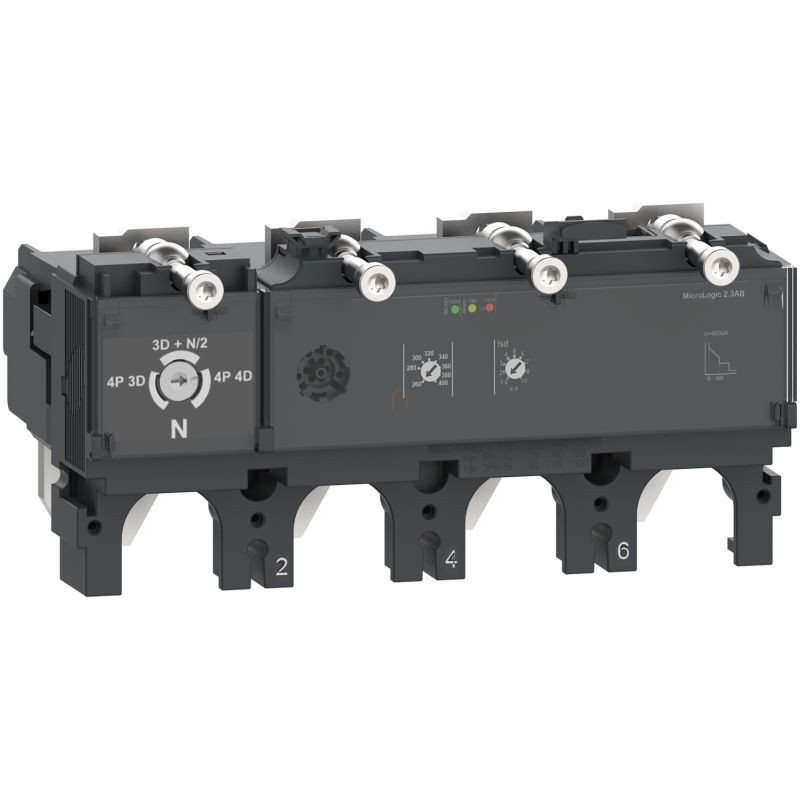 Acest MicroLogic 2.3 AB este o unitate de declanșare electronică cu 4 poli, 4d, utilizată la întrerupătoarele ComPacT NSX 400/630. Această unitate de declanșare electronică cu o putere nominală de 400 A este utilizată în sistemele de distribuție publică pentru a limita curentul furnizat în conformitate cu contractul de consum. Include protecție reglabilă împotriva suprasarcinii de lungă durată. În plus, oferă protecție reglabilă de scurtă durată și protecție instantanee fixă împotriva scurtcircuitelor. MicroLogic 2.3 AB indică suprasarcină cu LED-uri de alarmă. LED-ul verde Ready (Gata) clipește când întrerupătorul este gata să se declanșeze. Unitatea de declanșare este livrată cu un sigiliu de plumb pentru a proteja setările. Acest produs face parte din arhitectura noastră EcoStruxure Power atunci când este asociat cu cadrul de bază PowerTag NSX și ComPacT NSX.